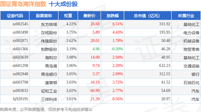 国证青岛海洋(980532)指数十大成份股详情如下: