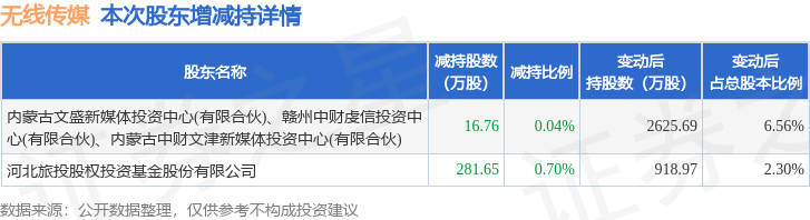 证券之星消息,2月3日无线传媒发布公告《无线传媒:关于持股5%以上股东股份减持完成的公告》,其股东河北旅投股权投资基金股份有限公司、内蒙古文盛新媒体投资中心(有限合伙)、赣州中财虔信投资中心(有限合伙)、内蒙古中财文津新媒体投资中心(有限合伙)于2025年12月16日至2026年1月30日间合计减持298.41万股,占公司目前总股本的0.746%,变动期间该股股价上涨12.19%,截止1月30日收盘报38.3元。