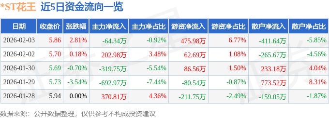 证券之星消息,截至2026年2月3日收盘,*ST花王(603007)报收于5.86元,上涨2.81%,换手率1.74%,成交量12.1万手,成交额7031.36万元。