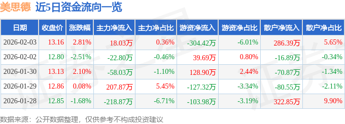 证券之星消息,截至2026年2月3日收盘,美思德(603041)报收于13.16元,上涨2.81%,换手率2.11%,成交量3.87万手,成交额5067.8万元。