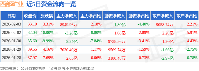 证券之星消息,截至2026年2月3日收盘,西部矿业(601168)报收于33.1元,上涨3.31%,换手率5.38%,成交量128.25万手,成交额40.97亿元。