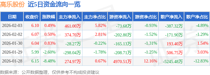 证券之星消息,截至2026年2月3日收盘,高乐股份(002348)报收于6.1元,上涨0.49%,换手率1.44%,成交量12.99万手,成交额7919.14万元。