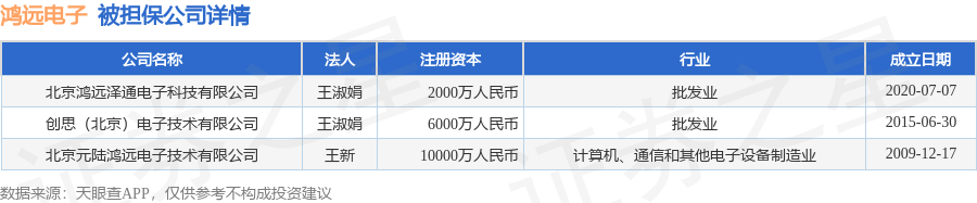 鸿远电子2月3日披露3笔对外担保,被担保公司3家。对外担保明细如下表: