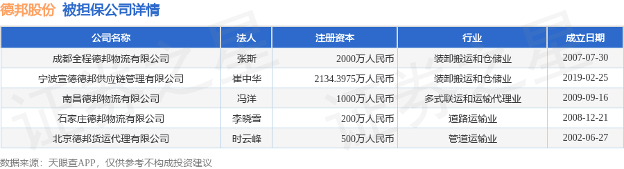 德邦股份2月3日披露8笔对外担保,被担保公司5家。对外担保明细如下表: