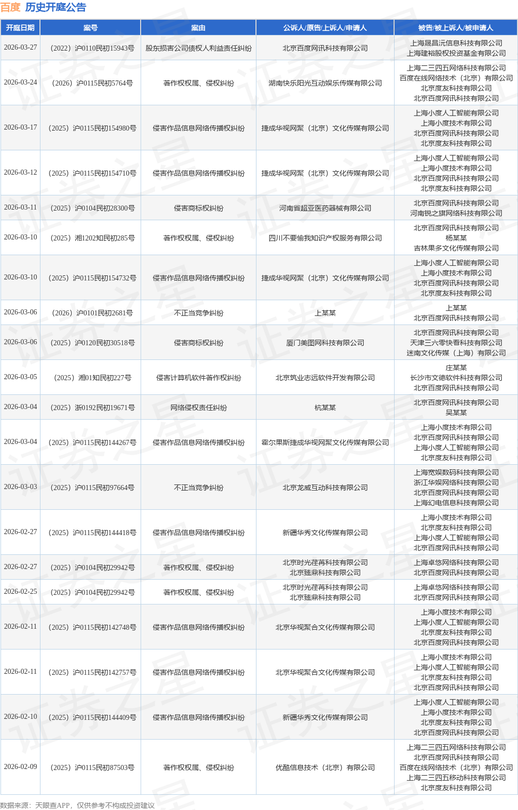 案号:(2025)沪73民终1202号根据统计,近一年内以北京百度网讯科技有限公司为当事人的历史开庭公告有328则,其中案由为“侵害作品信息网络传播权纠纷”的公告以72则居首,其次为“侵害商标权纠纷”有71则,“不正当竞争纠纷”有52则。历史开庭公告(前20条)如下: