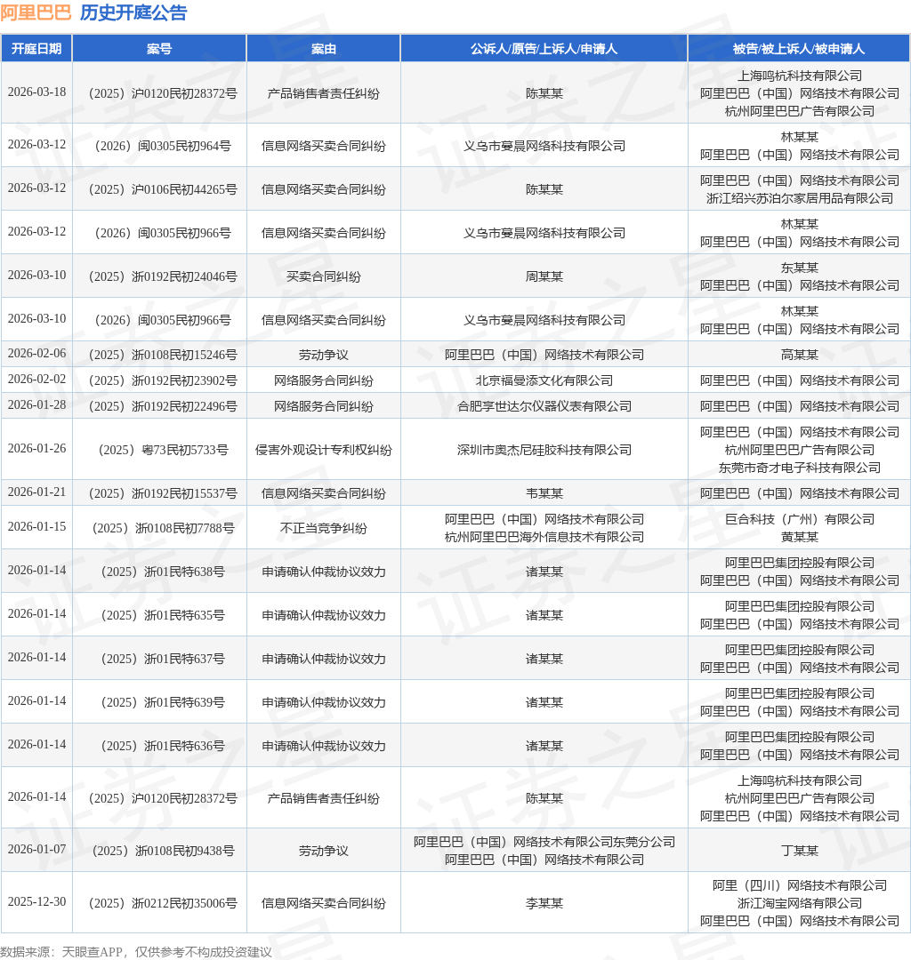 案号:(2025)浙0108民初15246号根据统计,近一年内以阿里巴巴(中国)网络技术有限公司为当事人的历史开庭公告有162则,其中案由为“网络服务合同纠纷”的公告以59则居首,其次为“侵害外观设计专利权纠纷”有15则,“著作权权属、侵权纠纷”有13则。历史开庭公告(前20条)如下: