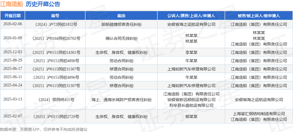 证券之星消息,根据天眼查APP显示,近日公布了一则江南造船(集团)有限责任公司作为被告/被上诉人的开庭公告,详细内容如下: