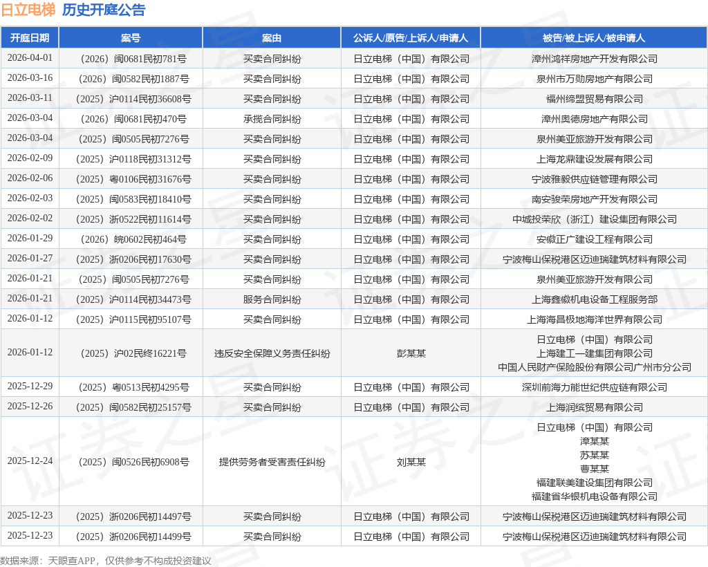 案号:(2025)粤0106民初31676号根据统计,近一年内以日立电梯(中国)有限公司为当事人的历史开庭公告有396则,其中案由为“买卖合同纠纷”的公告以310则居首,其次为“承揽合同纠纷”有18则,“合同纠纷”有14则。历史开庭公告(前20条)如下: