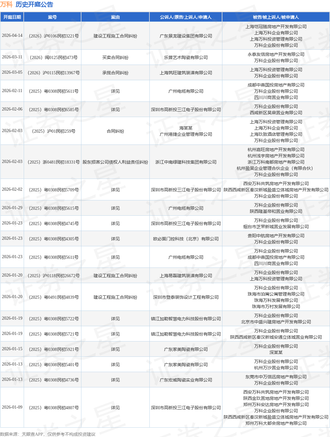 证券之星消息,根据天眼查APP显示,近日公布了一则万科企业股份有限公司作为被告/被上诉人的开庭公告,详细内容如下: