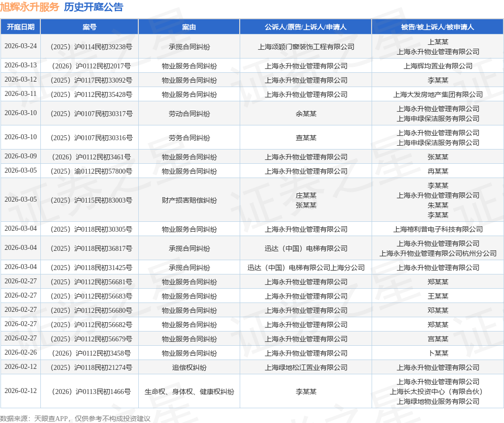 案号:(2026)沪0118民初2037号根据统计,近一年内以上海永升物业管理有限公司为当事人的历史开庭公告有411则,其中案由为“物业服务合同纠纷”的公告以226则居首,其次为“承揽合同纠纷”有28则,“服务合同纠纷”有27则。历史开庭公告(前20条)如下: