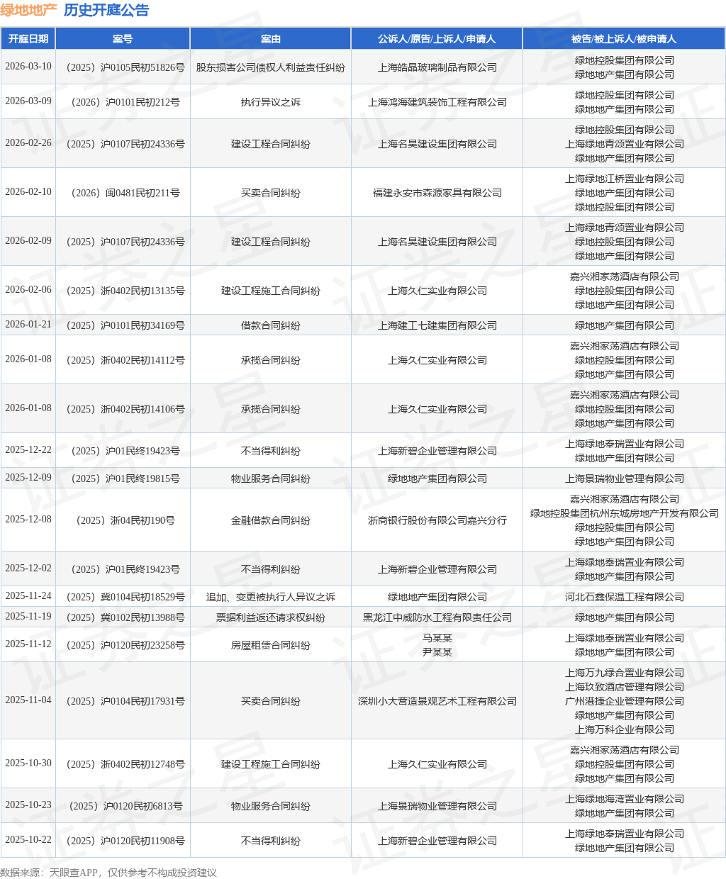 案号:(2025)浙0402民初13135号根据统计,近一年内以绿地地产集团有限公司为当事人的历史开庭公告有80则,其中案由为“建设工程合同纠纷”的公告以18则居首,其次为“建设工程施工合同纠纷”有13则,“金融借款合同纠纷”有7则。历史开庭公告(前20条)如下: