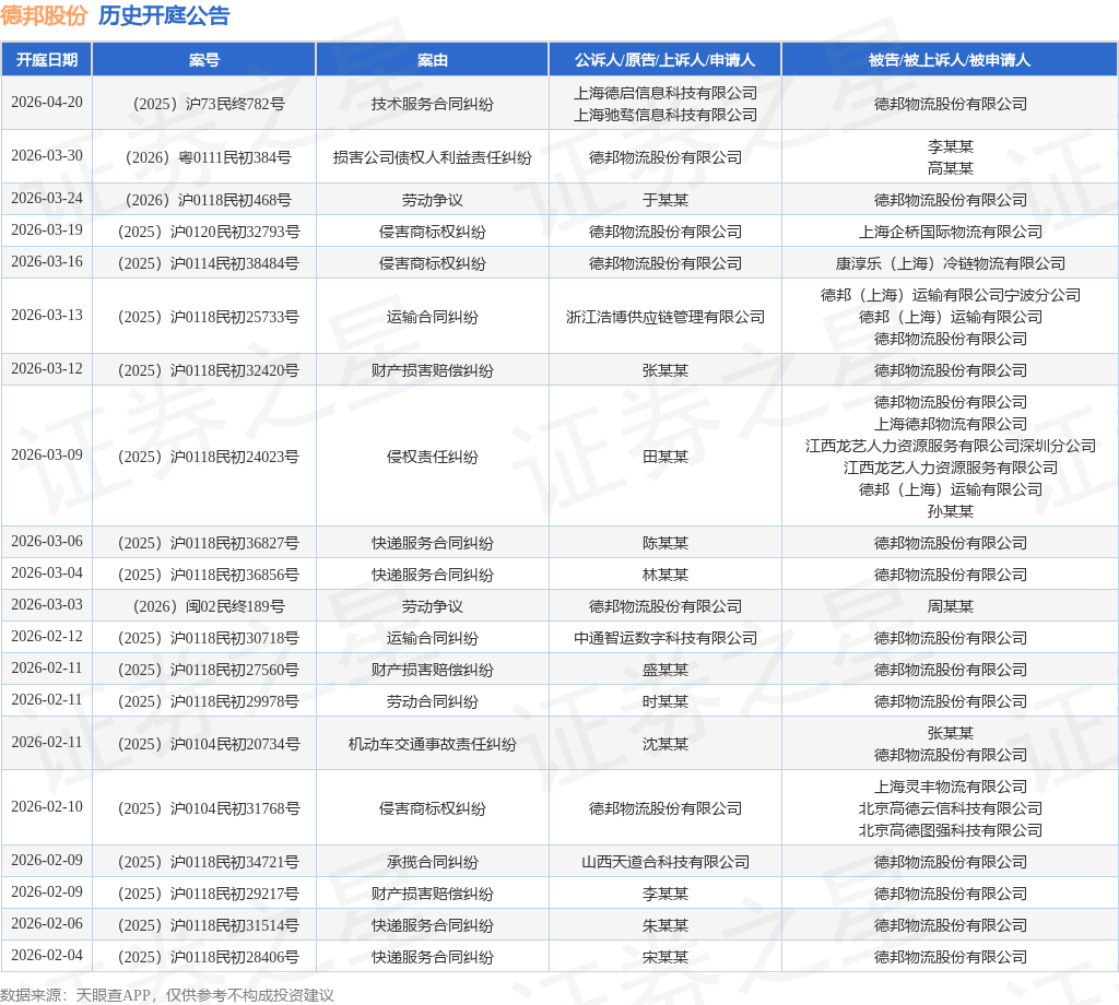 案号:(2025)沪0118民初31514号根据统计,近一年内以德邦物流股份有限公司为当事人的历史开庭公告有376则,其中案由为“快递服务合同纠纷”的公告以102则居首,其次为“运输合同纠纷”有73则,“劳动争议”有25则。历史开庭公告(前20条)如下:
