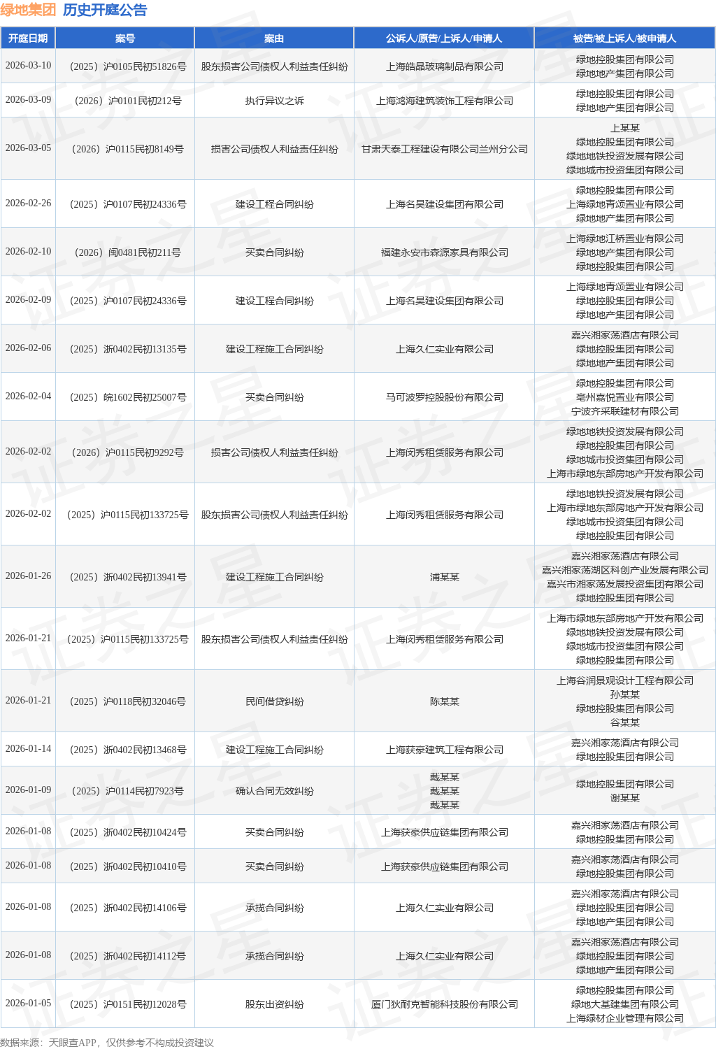 案号:(2025)浙0402民初13135号根据统计,近一年内以绿地控股集团有限公司为当事人的历史开庭公告有215则,其中案由为“建设工程施工合同纠纷”的公告以45则居首,其次为“金融借款合同纠纷”有24则,“买卖合同纠纷”有18则。历史开庭公告(前20条)如下: