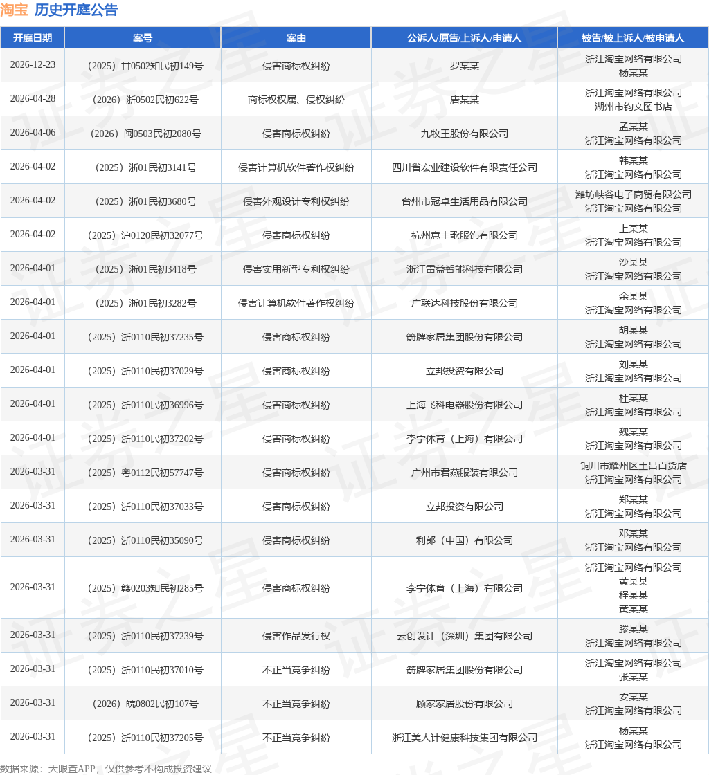 案号:(2025)浙01民初3135号根据统计,近一年内以浙江淘宝网络有限公司为当事人的历史开庭公告有7496则,其中案由为“侵害商标权纠纷”的公告以3475则居首,其次为“侵害外观设计专利权纠纷”有542则,“网络服务合同纠纷”有536则。历史开庭公告(前20条)如下:
