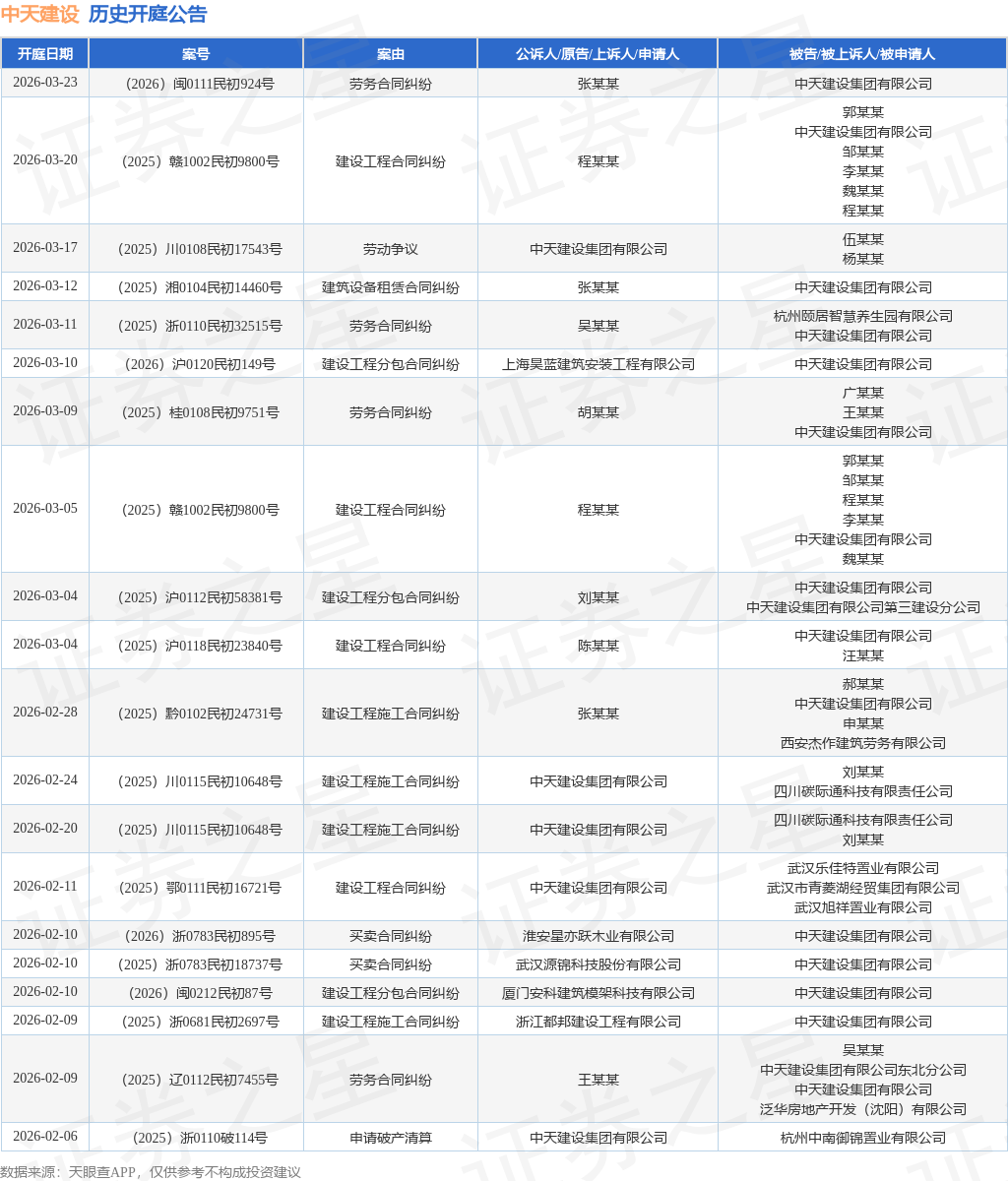 案号:(2026)浙0783民初1536号根据统计,近一年内以中天建设集团有限公司为当事人的历史开庭公告有1406则,其中案由为“买卖合同纠纷”的公告以453则居首,其次为“建设工程施工合同纠纷”有203则,“建设工程分包合同纠纷”有141则。历史开庭公告(前20条)如下: