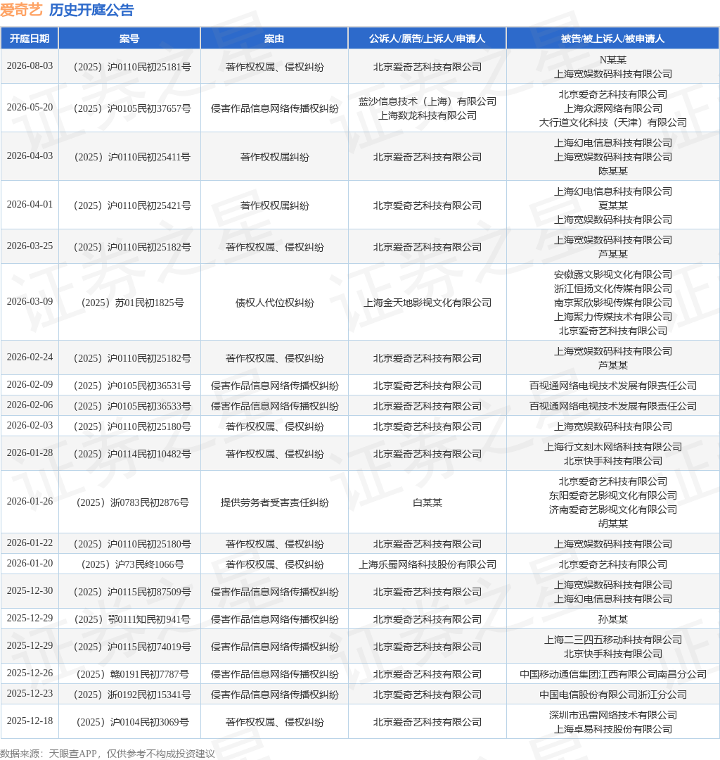 案号:(2025)沪0105民初36533号根据统计,近一年内以北京爱奇艺科技有限公司为当事人的历史开庭公告有287则,其中案由为“侵害作品信息网络传播权纠纷”的公告以210则居首,其次为“著作权权属、侵权纠纷”有23则,“不正当竞争纠纷”有13则。历史开庭公告(前20条)如下: