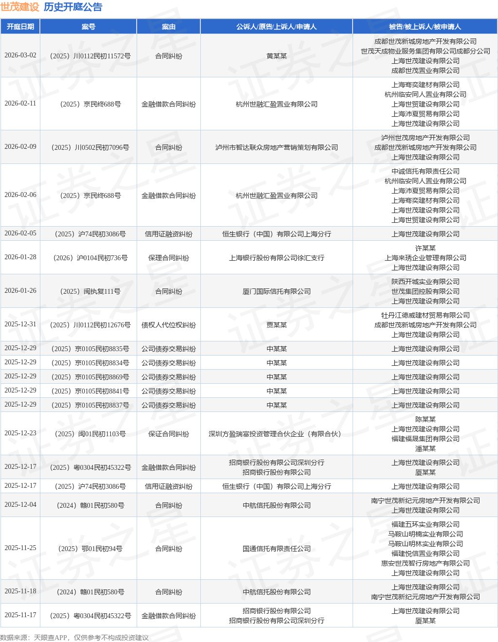 案号:(2025)京民终688号根据统计,近一年内以上海世茂建设有限公司为当事人的历史开庭公告有75则,其中案由为“金融借款合同纠纷”的公告以21则居首,其次为“合同纠纷”有16则,“股东损害公司债权人利益责任纠纷”有7则。历史开庭公告(前20条)如下: