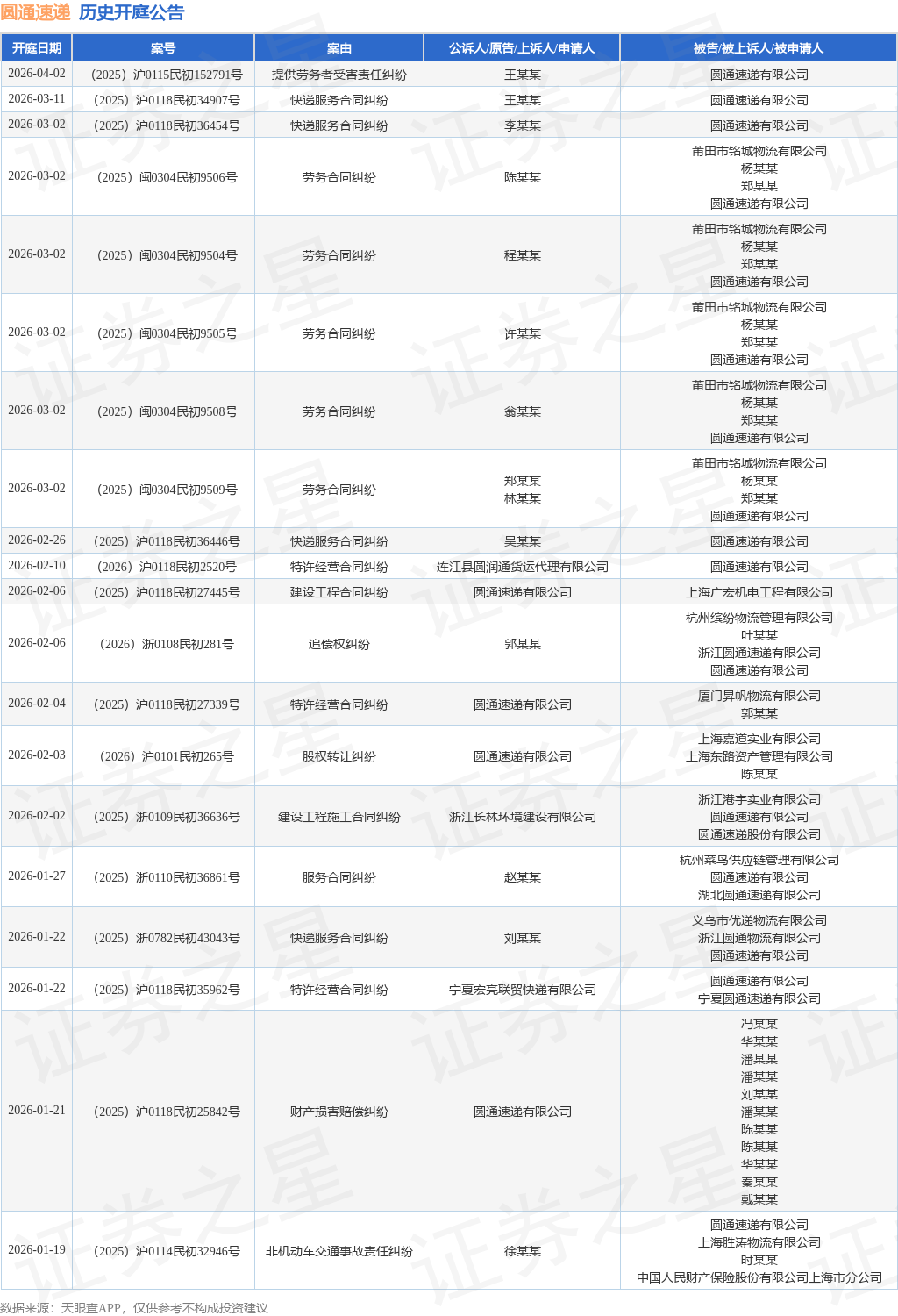 案号:(2026)浙0108民初281号根据统计,近一年内以圆通速递有限公司为当事人的历史开庭公告有175则,其中案由为“快递服务合同纠纷”的公告以44则居首,其次为“特许经营合同纠纷”有24则,“财产损害赔偿纠纷”有15则。历史开庭公告(前20条)如下: