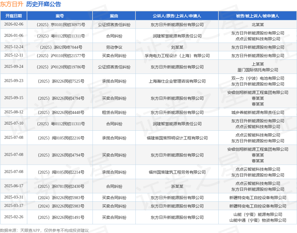 案号:(2025)京0101民初30975号根据统计,近一年内以东方日升新能源股份有限公司为当事人的历史开庭公告有16则,其中案由为“买卖合同纠纷”的公告以6则居首,其次为“合同纠纷”有3则,“承揽合同纠纷”有3则。历史开庭公告如下: