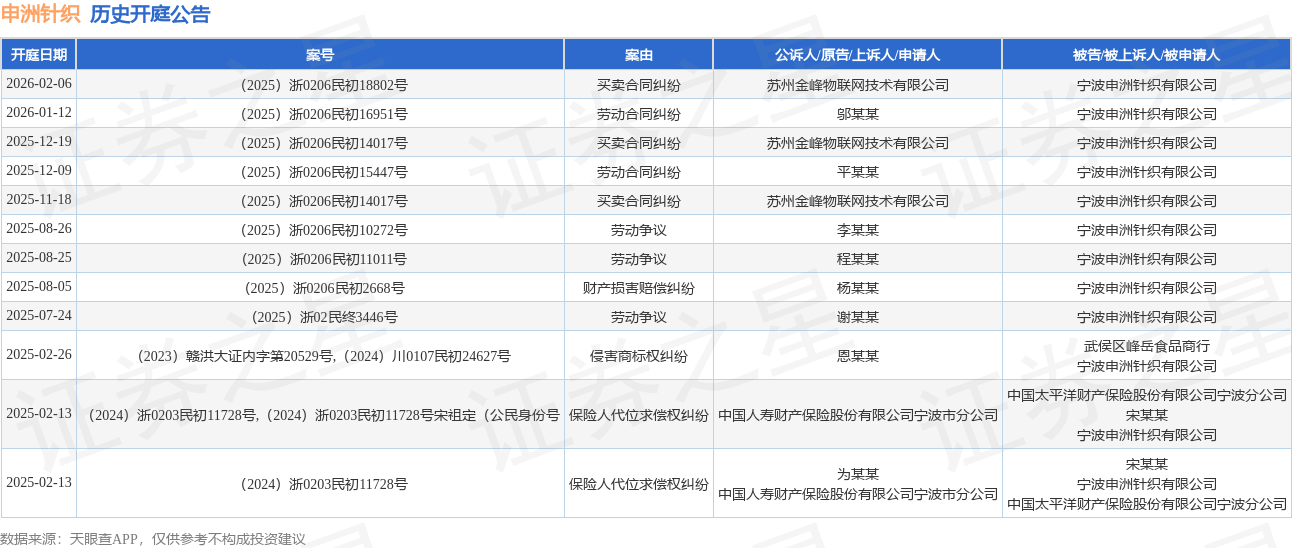 案号:(2025)浙0206民初18802号根据统计,近一年内以宁波申洲针织有限公司为当事人的历史开庭公告有12则,其中案由为“买卖合同纠纷”的公告以3则居首,其次为“劳动争议”有3则,“保险人代位求偿权纠纷”有2则。历史开庭公告如下: