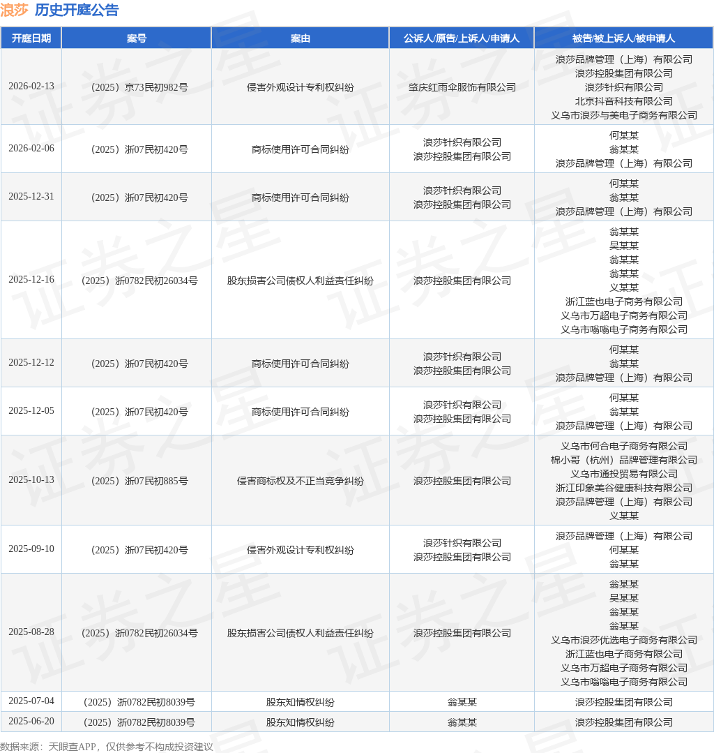 案号:(2025)浙07民初420号根据统计,近一年内以浪莎控股集团有限公司为当事人的历史开庭公告有11则,其中案由为“商标使用许可合同纠纷”的公告以4则居首,其次为“侵害外观设计专利权纠纷”有2则,“股东损害公司债权人利益责任纠纷”有2则。历史开庭公告如下: