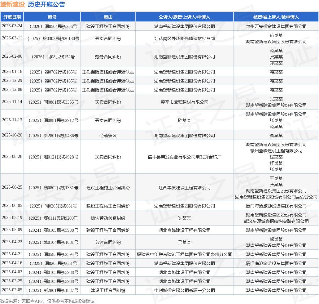 案号:(2026)闽08民终152号根据统计,近一年内以湖南望新建设集团股份有限公司为当事人的历史开庭公告有20则,其中案由为“建设工程施工合同纠纷”的公告以8则居首,其次为“买卖合同纠纷”有4则,“工伤保险资格或者待遇认定”有3则。历史开庭公告如下: