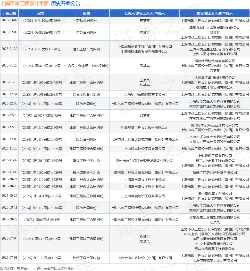 案号:(2026)闽0823民初171号根据统计,近一年内以上海市政工程设计研究总院(集团)有限公司为当事人的历史开庭公告有29则,其中案由为“建设工程施工合同纠纷”的公告以11则居首,其次为“建设工程合同纠纷”有4则,“建设工程设计合同纠纷”有4则。历史开庭公告(前20条)如下: