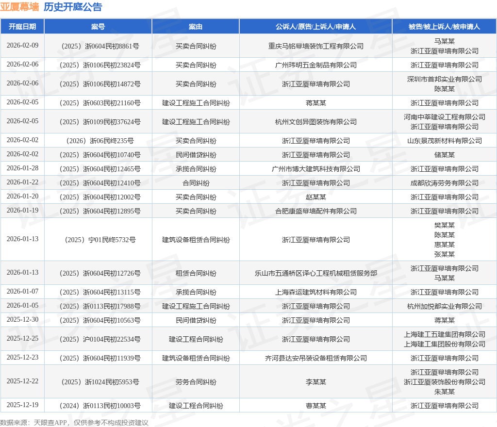 案号:(2025)浙0106民初14872号根据统计,近一年内以浙江亚厦幕墙有限公司为当事人的历史开庭公告有235则,其中案由为“买卖合同纠纷”的公告以47则居首,其次为“建设工程施工合同纠纷”有36则,“建筑设备租赁合同纠纷”有26则。历史开庭公告(前20条)如下: