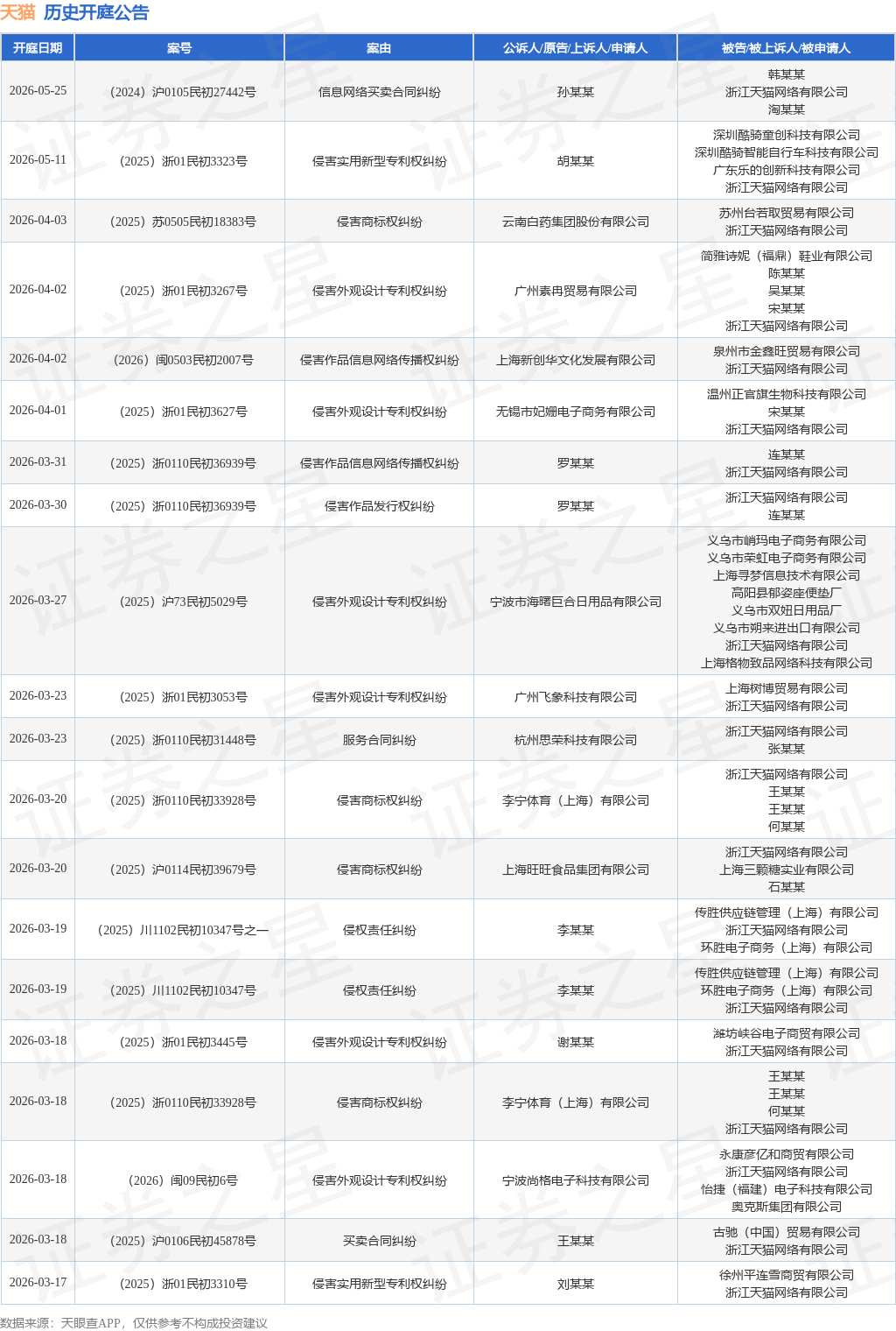 案号:(2025)浙0110民初36730号根据统计,近一年内以浙江天猫网络有限公司为当事人的历史开庭公告有2069则,其中案由为“著作权权属、侵权纠纷”的公告以410则居首,其次为“侵害外观设计专利权纠纷”有327则,“侵害商标权纠纷”有309则。历史开庭公告(前20条)如下: