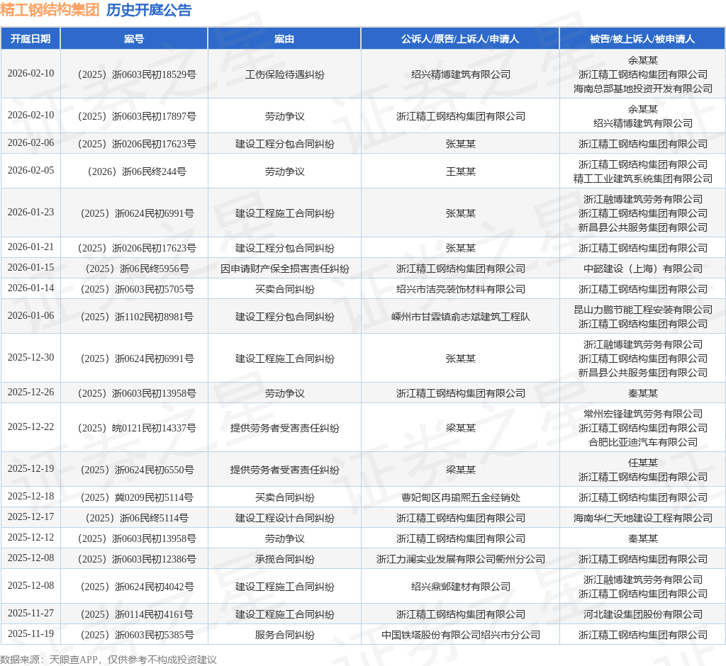案号:(2025)浙0206民初17623号根据统计,近一年内以浙江精工钢结构集团有限公司为当事人的历史开庭公告有76则,其中案由为“建设工程分包合同纠纷”的公告以15则居首,其次为“建设工程施工合同纠纷”有11则,“劳动争议”有10则。历史开庭公告(前20条)如下: