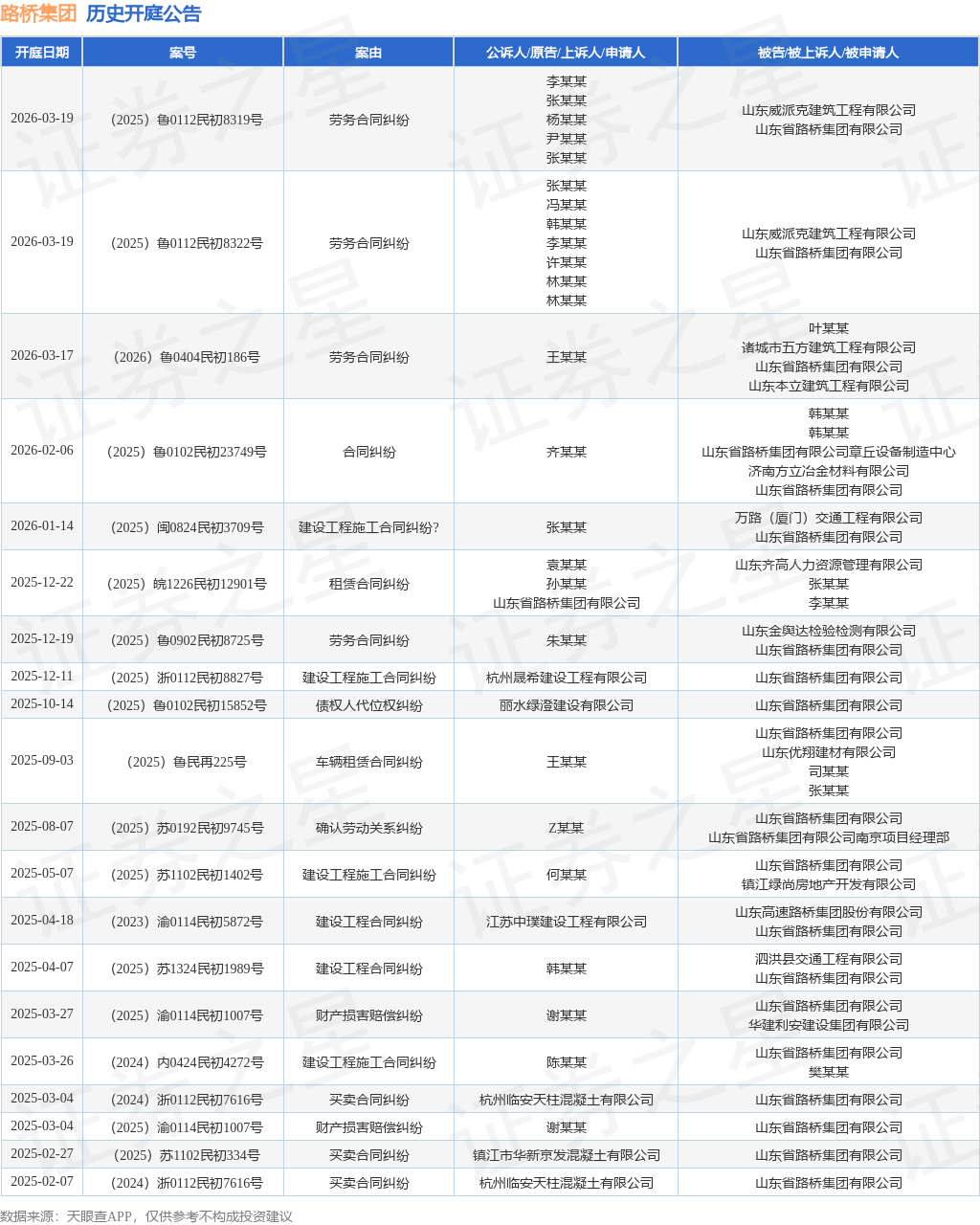 案号:(2025)鲁0102民初23749号根据统计,近一年内以山东省路桥集团有限公司为当事人的历史开庭公告有20则,其中案由为“劳务合同纠纷”的公告以4则居首,其次为“买卖合同纠纷”有3则,“建设工程施工合同纠纷”有3则。历史开庭公告如下: