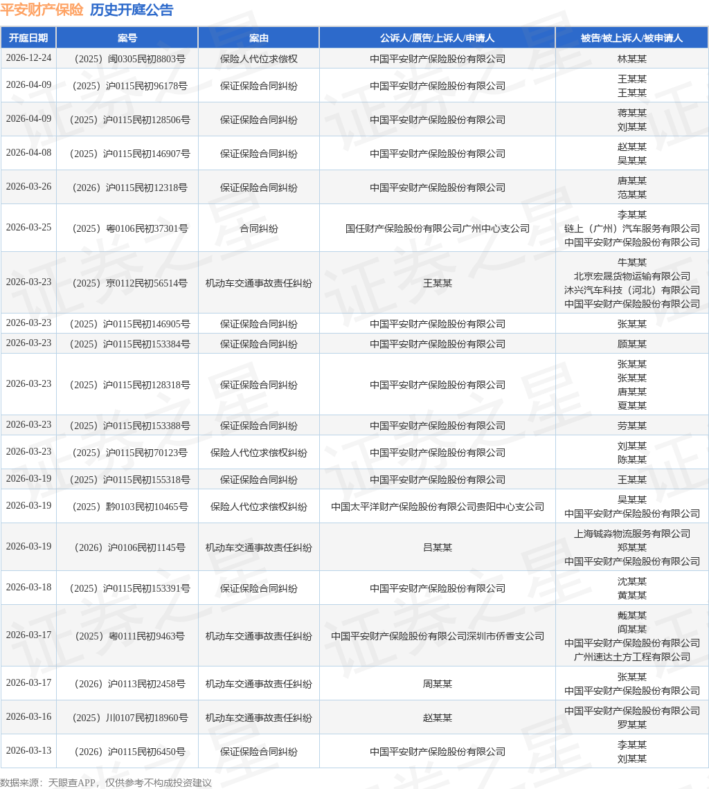 案号:(2026)闽民再30号根据统计,近一年内以中国平安财产保险股份有限公司为当事人的历史开庭公告有1962则,其中案由为“机动车交通事故责任纠纷”的公告以942则居首,其次为“保证保险合同纠纷”有258则,“保险人代位求偿权纠纷”有166则。历史开庭公告(前20条)如下: