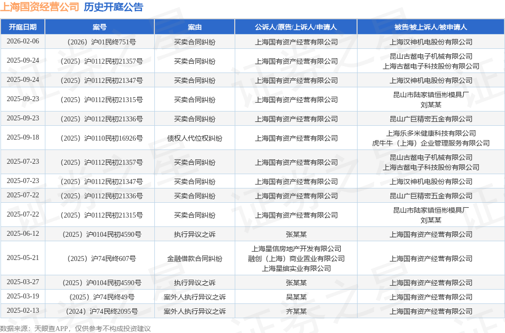 案号:(2026)沪01民终751号根据统计,近一年内以上海国有资产经营有限公司为当事人的历史开庭公告有15则,其中案由为“买卖合同纠纷”的公告以9则居首,其次为“执行异议之诉”有2则,“案外人执行异议之诉”有2则。历史开庭公告如下: