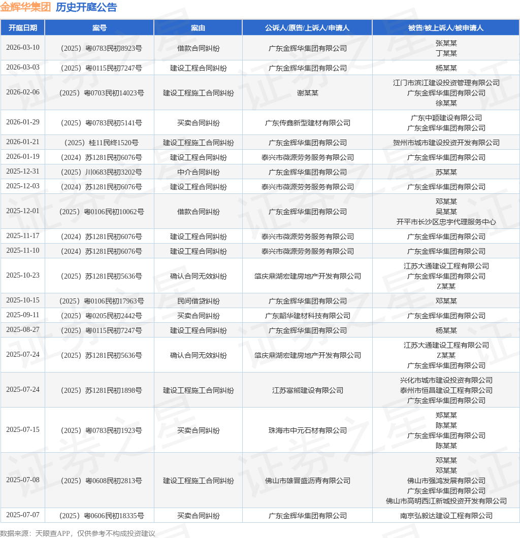 案号:(2025)粤0703民初14023号根据统计,近一年内以广东金辉华集团有限公司为当事人的历史开庭公告有46则,其中案由为“建设工程施工合同纠纷”的公告以16则居首,其次为“建设工程合同纠纷”有14则,“买卖合同纠纷”有6则。历史开庭公告(前20条)如下: