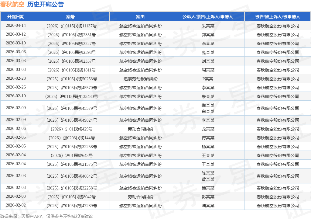 案号:(2026)沪01民终429号根据统计,近一年内以春秋航空股份有限公司为当事人的历史开庭公告有174则,其中案由为“航空旅客运输合同纠纷”的公告以129则居首,其次为“网络服务合同纠纷”有15则,“劳动合同纠纷”有14则。历史开庭公告(前20条)如下: