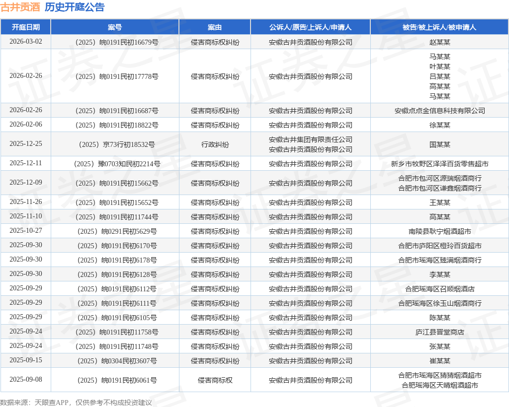 案号:(2025)皖0191民初18822号根据统计,近一年内以安徽古井贡酒股份有限公司为当事人的历史开庭公告有59则,其中案由为“侵害商标权纠纷”的公告以44则居首,其次为“不正当竞争纠纷”有5则,“行政纠纷”有5则。历史开庭公告(前20条)如下: