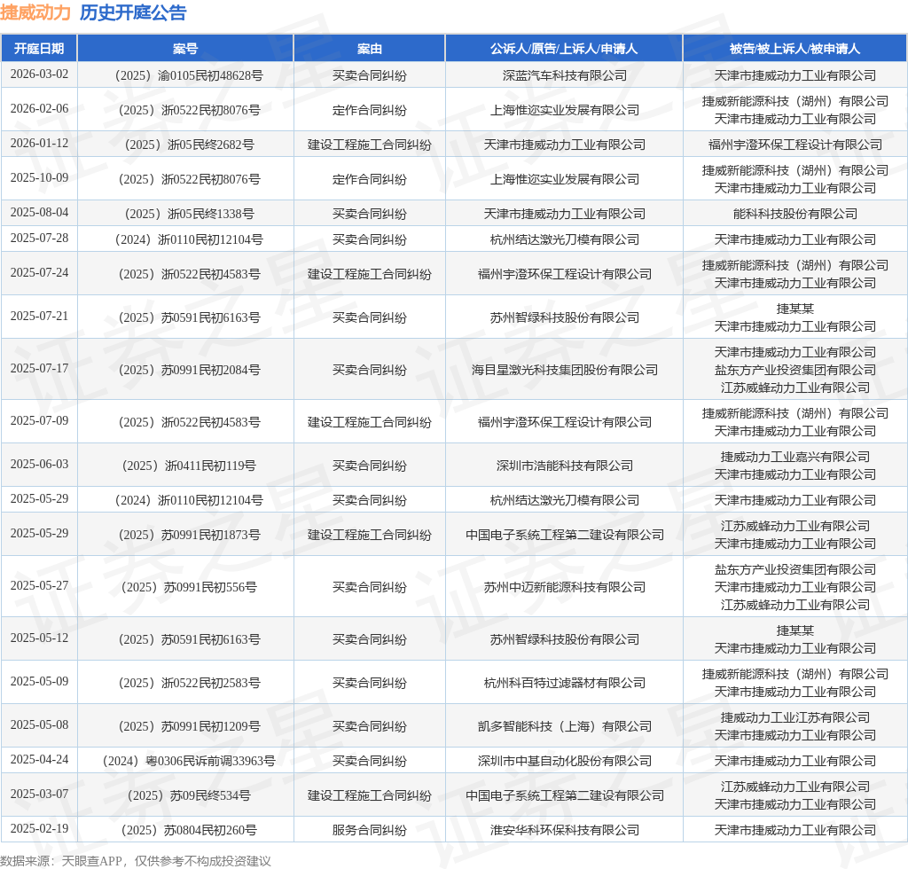 案号:(2025)浙0522民初8076号根据统计,近一年内以天津市捷威动力工业有限公司为当事人的历史开庭公告有20则,其中案由为“买卖合同纠纷”的公告以12则居首,其次为“建设工程施工合同纠纷”有5则,“定作合同纠纷”有2则。历史开庭公告如下: