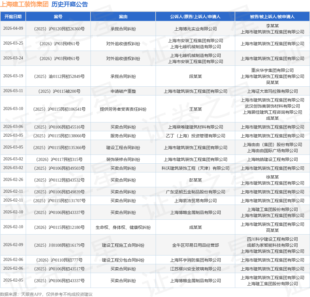 案号:(2025)沪0106民初43517号根据统计,近一年内以上海市建筑装饰工程集团有限公司为当事人的历史开庭公告有421则,其中案由为“买卖合同纠纷”的公告以160则居首,其次为“建设工程施工合同纠纷”有53则,“装饰装修合同纠纷”有44则。历史开庭公告(前20条)如下:
