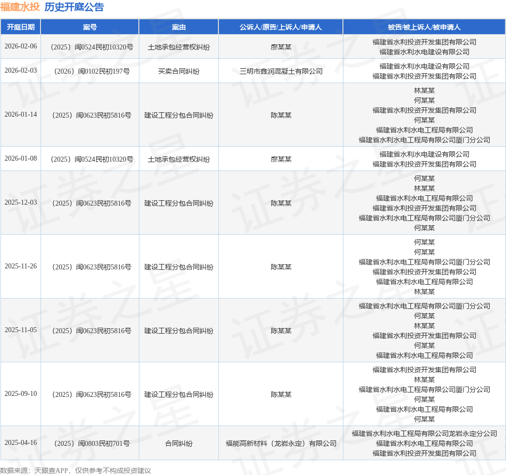 案号:(2025)闽0524民初10320号根据统计,近一年内以福建省水利投资开发集团有限公司为当事人的历史开庭公告有9则,其中案由为“建设工程分包合同纠纷”的公告以5则居首,其次为“土地承包经营权纠纷”有2则,“买卖合同纠纷”有1则。历史开庭公告如下: