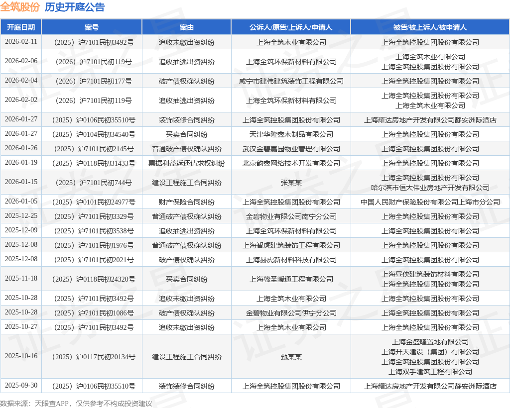 案号:(2026)沪7101民初119号根据统计,近一年内以上海全筑控股集团股份有限公司为当事人的历史开庭公告有80则,其中案由为“破产债权确认纠纷”的公告以20则居首,其次为“普通破产债权确认纠纷”有10则,“装饰装修合同纠纷”有10则。历史开庭公告(前20条)如下: