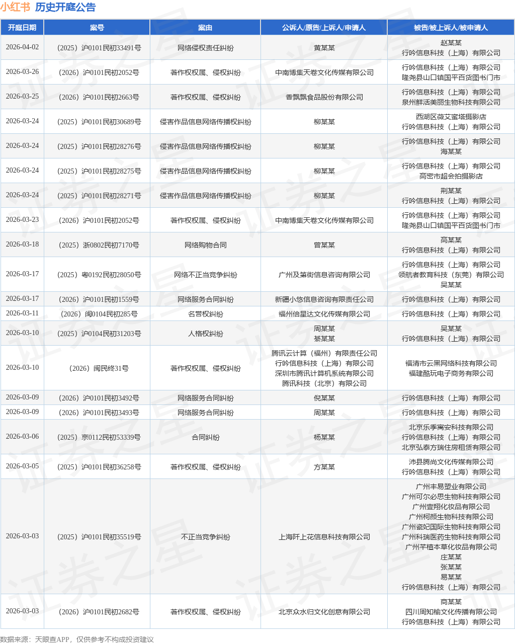 案号:(2025)沪0101民初34611号根据统计,近一年内以行吟信息科技(上海)有限公司为当事人的历史开庭公告有1239则,其中案由为“网络侵权责任纠纷”的公告以415则居首,其次为“网络服务合同纠纷”有279则,“名誉权纠纷”有114则。历史开庭公告(前20条)如下: