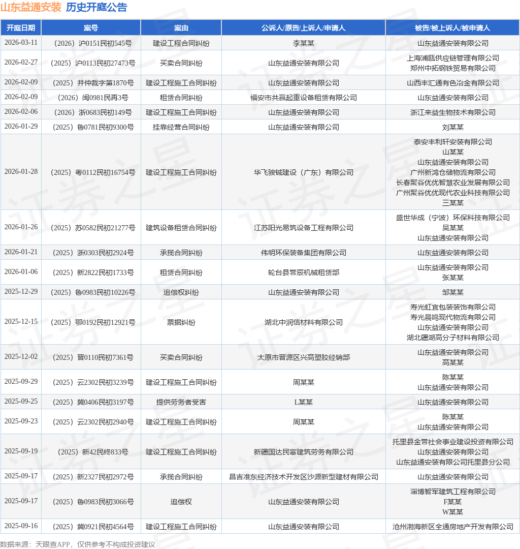 案号:(2026)浙0683民初149号根据统计,近一年内以山东益通安装有限公司为当事人的历史开庭公告有113则,其中案由为“建设工程施工合同纠纷”的公告以30则居首,其次为“租赁合同纠纷”有14则,“买卖合同纠纷”有9则。历史开庭公告(前20条)如下: