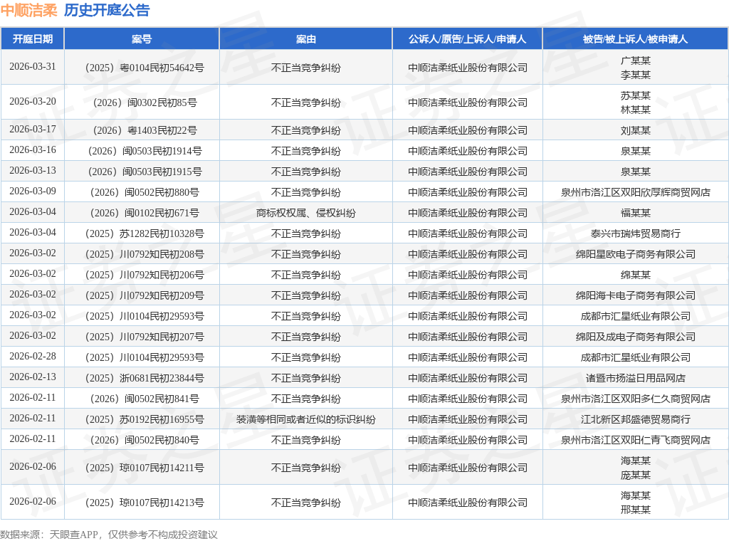 案号:(2025)琼0107民初14206号根据统计,近一年内以中顺洁柔纸业股份有限公司为当事人的历史开庭公告有296则,其中案由为“不正当竞争纠纷”的公告以221则居首,其次为“侵害商标权纠纷”有30则,“擅自使用与他人有一定影响的商品名称、包装、装潢等相同或者近似的标识纠纷”有20则。历史开庭公告(前20条)如下:
