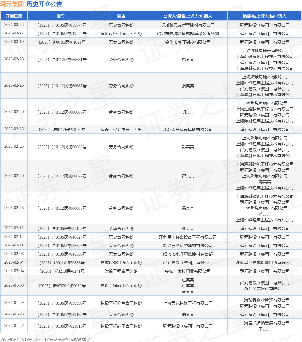 案号:(2025)沪0105民初46389号根据统计,近一年内以舜元建设(集团)有限公司为当事人的历史开庭公告有243则,其中案由为“买卖合同纠纷”的公告以75则居首,其次为“劳务合同纠纷”有49则,“建设工程施工合同纠纷”有29则。历史开庭公告(前20条)如下: