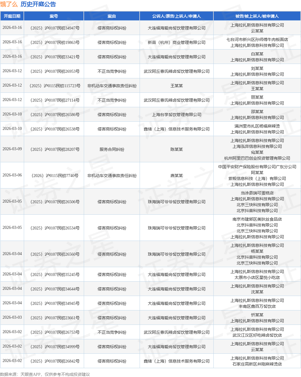 案号:(2026)沪0110民初1003号根据统计,近一年内以上海拉扎斯信息科技有限公司为当事人的历史开庭公告有479则,其中案由为“非机动车交通事故责任纠纷”的公告以241则居首,其次为“侵害商标权纠纷”有92则,“机动车交通事故责任纠纷”有40则。历史开庭公告(前20条)如下: