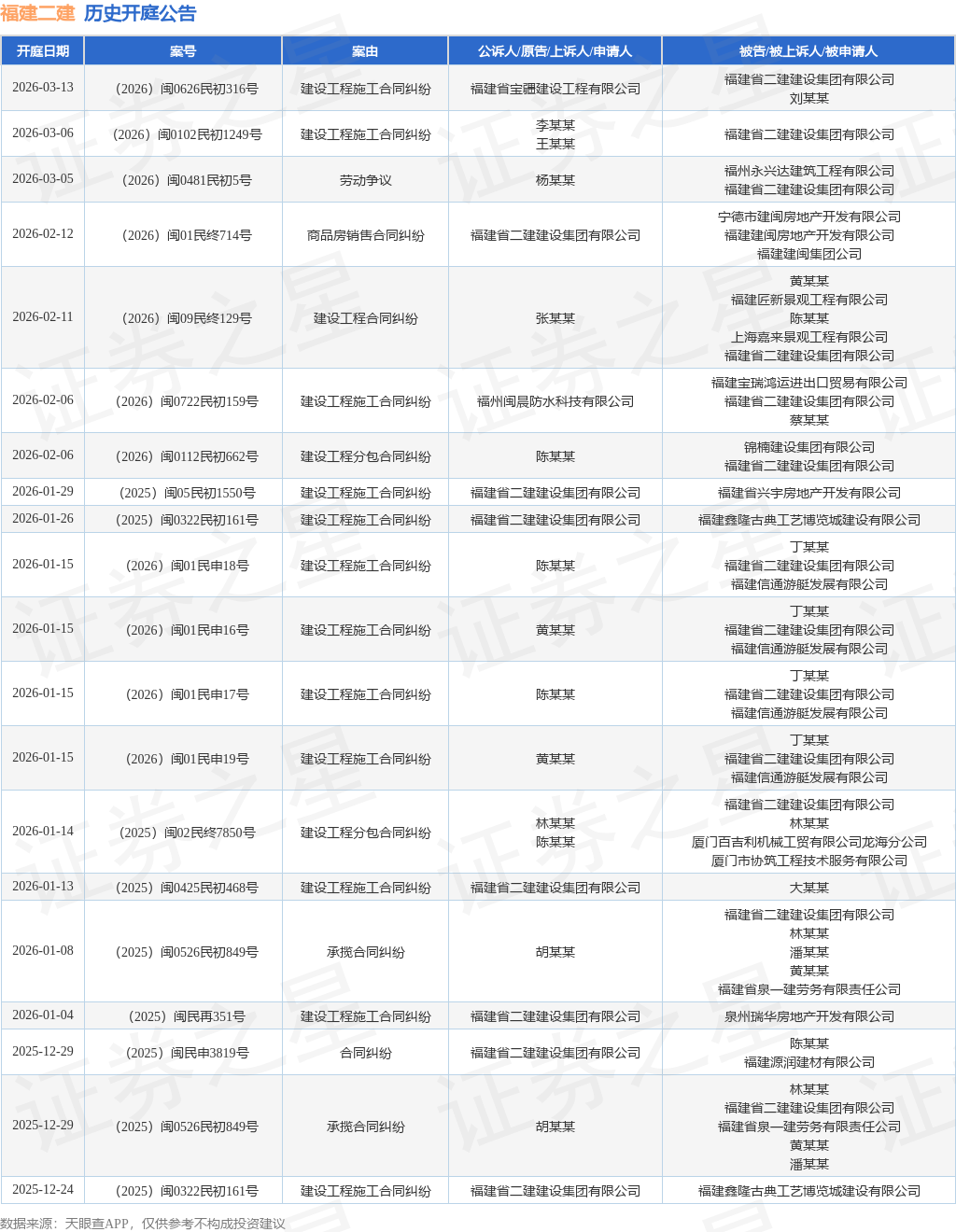 案号:(2026)闽0722民初159号根据统计,近一年内以福建省二建建设集团有限公司为当事人的历史开庭公告有119则,其中案由为“建设工程施工合同纠纷”的公告以41则居首,其次为“建设工程分包合同纠纷”有16则,“劳务合同纠纷”有13则。历史开庭公告(前20条)如下: