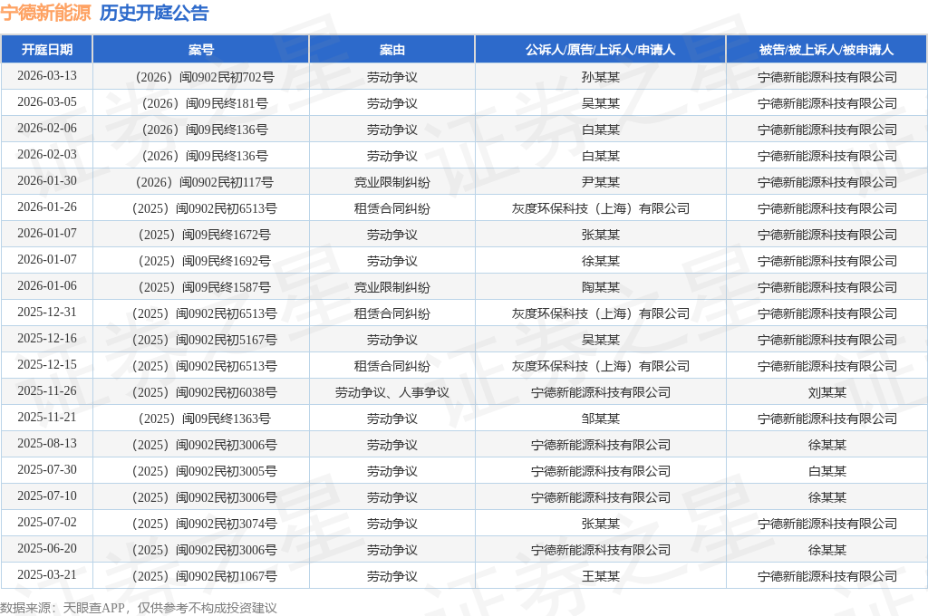 案号:(2026)闽09民终136号根据统计,近一年内以宁德新能源科技有限公司为当事人的历史开庭公告有26则,其中案由为“劳动争议”的公告以20则居首,其次为“租赁合同纠纷”有3则,“竞业限制纠纷”有2则。历史开庭公告(前20条)如下: