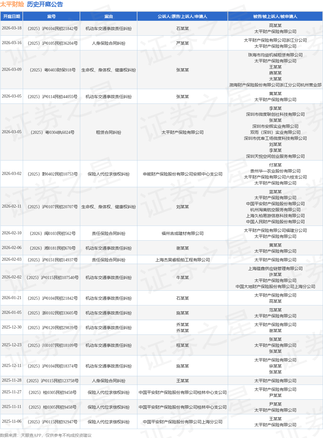 案号:(2026)湘0181民初670号根据统计,近一年内以太平财产保险有限公司为当事人的历史开庭公告有132则,其中案由为“机动车交通事故责任纠纷”的公告以77则居首,其次为“保险人代位求偿权纠纷”有19则,“人身保险合同纠纷”有9则。历史开庭公告(前20条)如下: