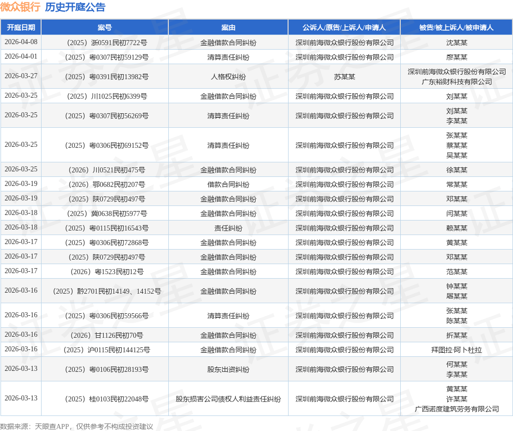 案号:(2025)云2525民初1799号根据统计,近一年内以深圳前海微众银行股份有限公司为当事人的历史开庭公告有1838则,其中案由为“金融借款合同纠纷”的公告以1248则居首,其次为“清算责任纠纷”有188则,“股东损害公司债权人利益责任纠纷”有155则。历史开庭公告(前20条)如下: