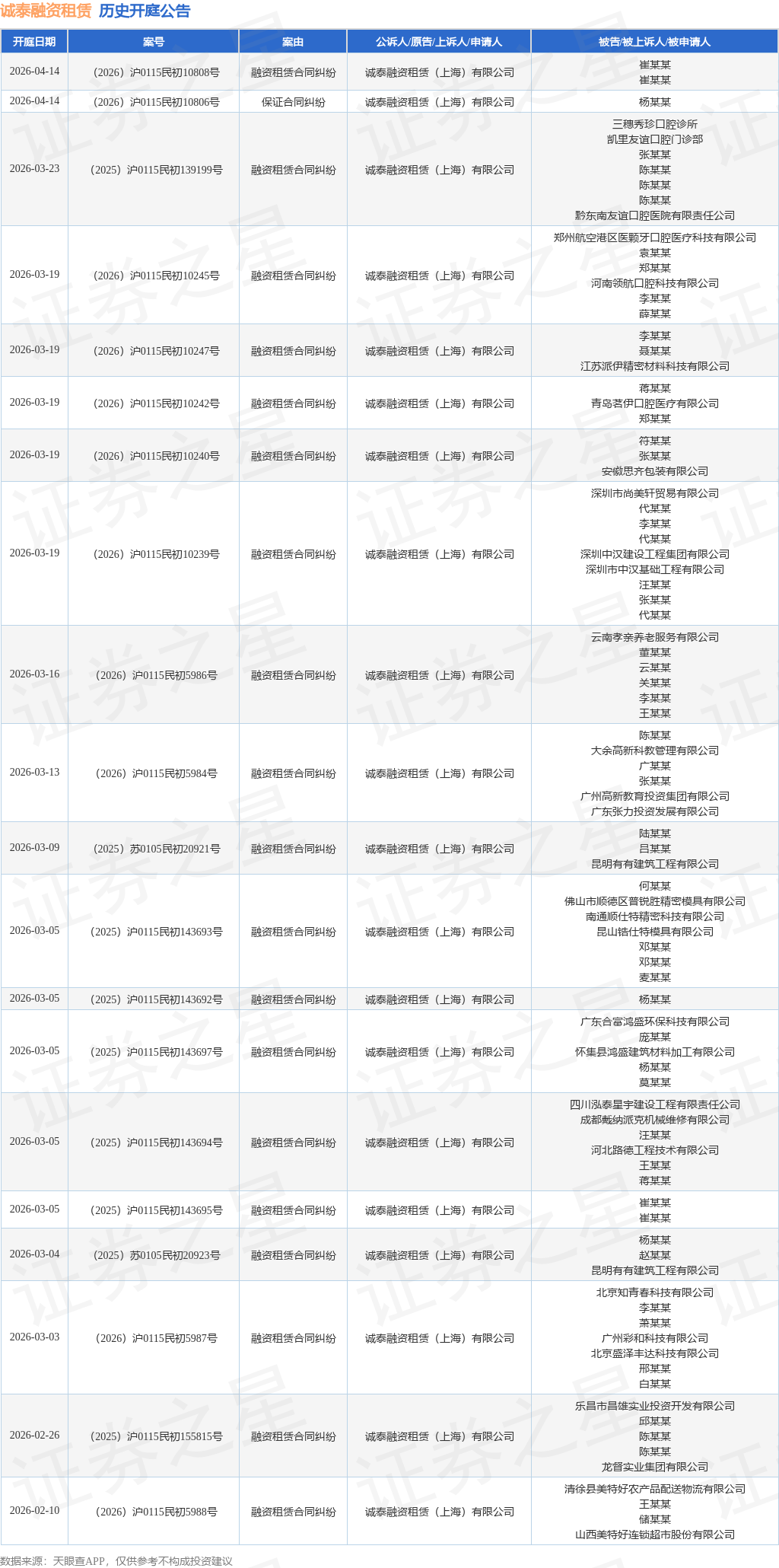 案号:(2025)沪0115民初128239号根据统计,近一年内以诚泰融资租赁(上海)有限公司为当事人的历史开庭公告有188则,其中案由为“融资租赁合同纠纷”的公告以171则居首,其次为“金融借款合同纠纷”有6则,“不当得利纠纷”有4则。历史开庭公告(前20条)如下: